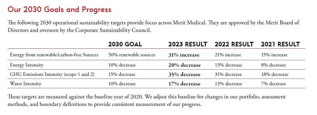 Merit Medical has adopted the following greenhouse gas reduction targets. Our targets are reviewed and approved by the Governance and Sustainability Committee of our Board of Directors.
