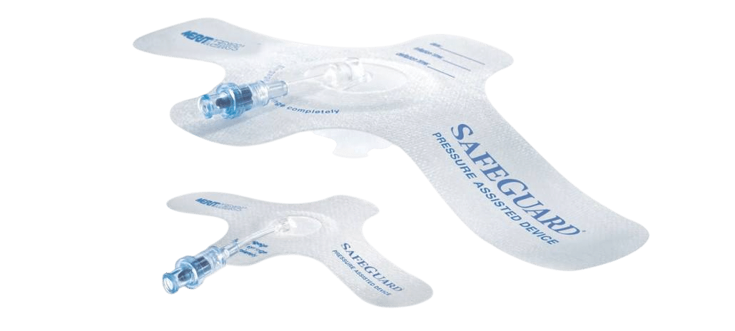 Safeguard delivers adjustable active compression and enables immediate pressure adjustment, maintains consistent pressure on the site during patient recovery as well as patient positioning and transport, and provides site management control for non-compliant patients. Additionally, it facilitates site assessment through a clear window without removing the device.