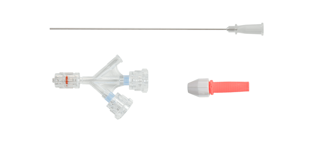 (includes hemostasis valve, guide wire insertion tool, pin torque device) – Maintains hemostasis without compromising catheter movement or restriction of contrast flow.